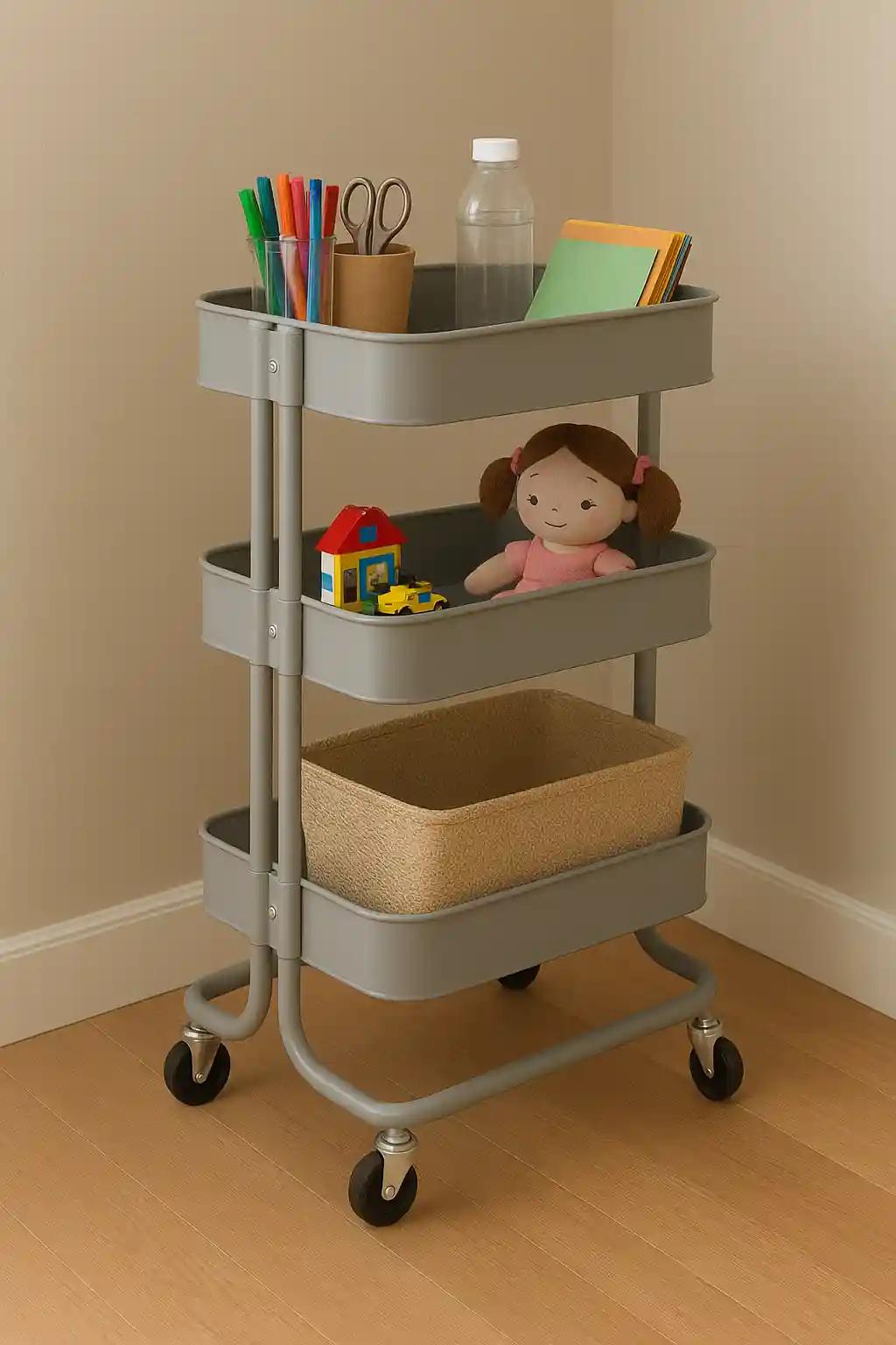 Rolling carts come in various sizes and are great for craft supplies, LEGO sets, or dolls. They can be moved from room to room and tucked away in closets when not in use.