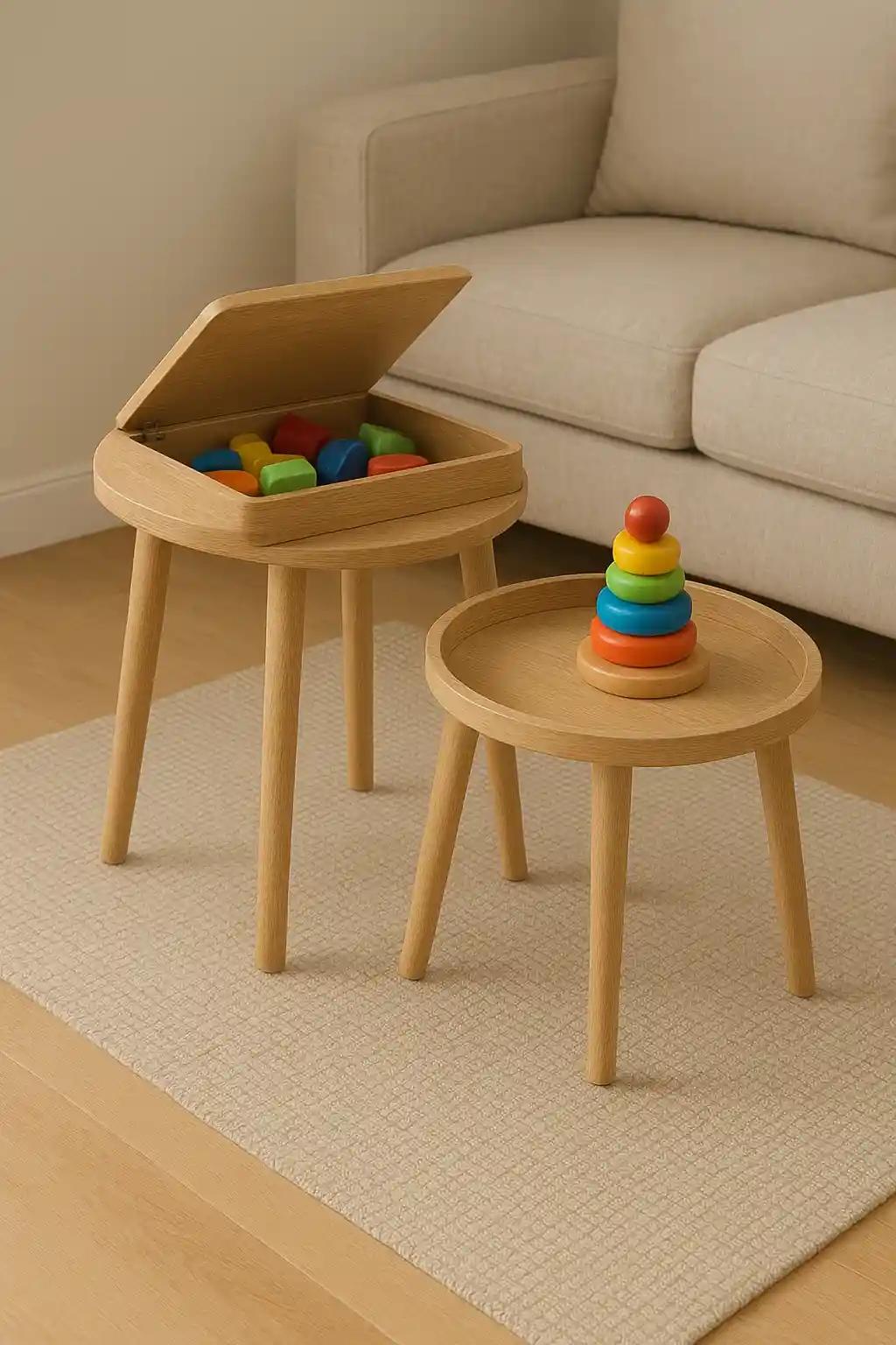 Nesting tables can be stacked or used separately. Opt for ones with hidden compartments or trays. They work well in living rooms where you want quick toy access without visible clutter.