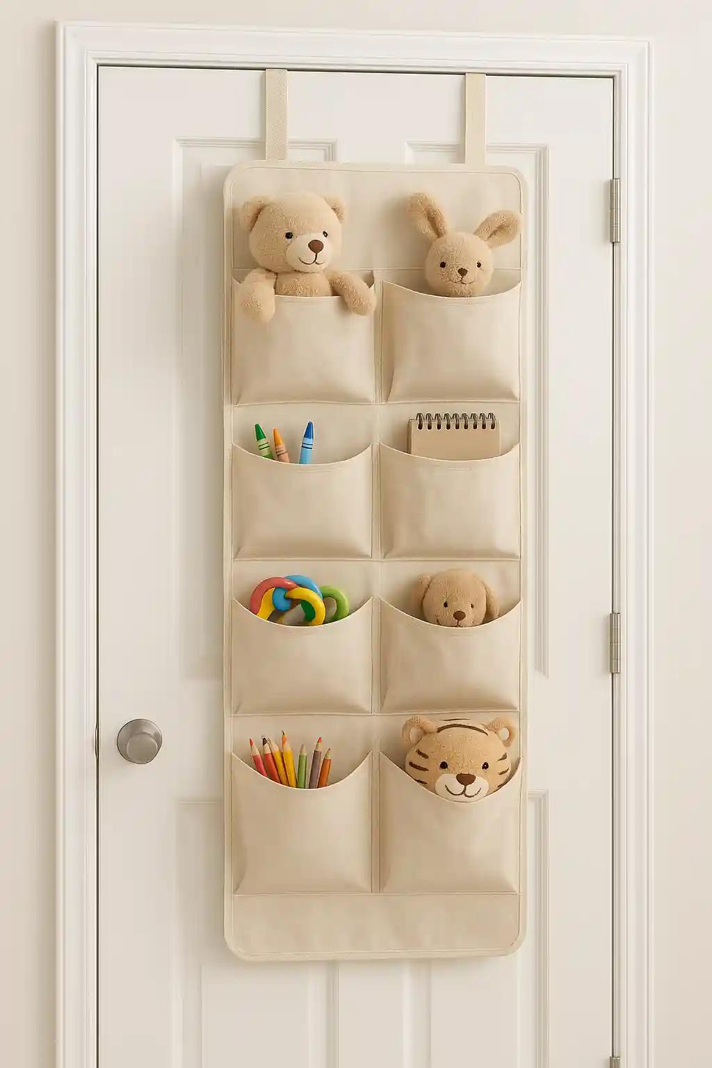 These organisers hang on the back of doors and come with pockets or shelves. They’re perfect for storing small toys, art supplies, or stuffed animals. You can hang them on bedroom, bathroom, or closet doors.