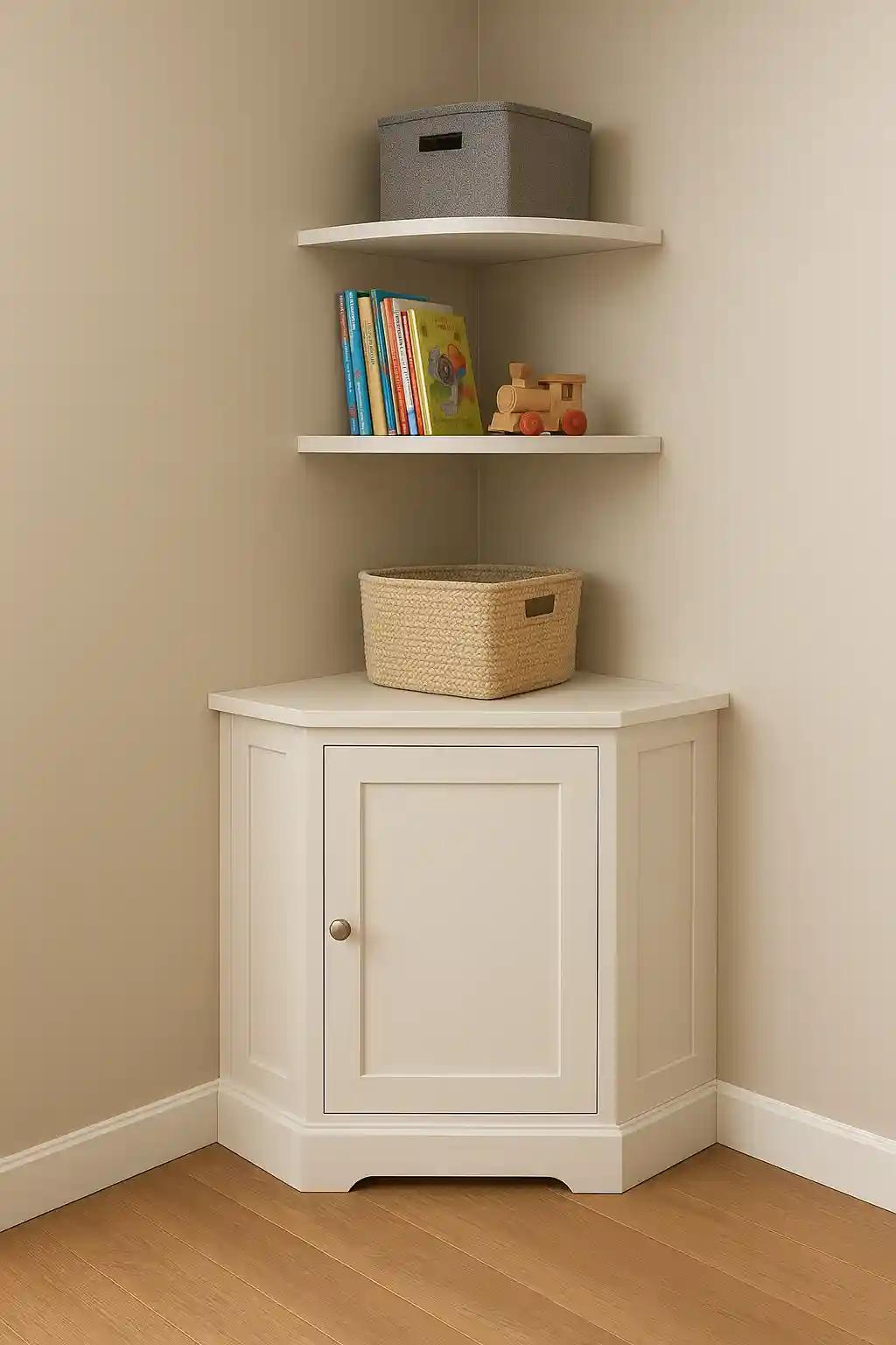 Maximise awkward corners in your home by installing corner shelves or using corner cabinets. These spaces are often wasted, but they can be perfect for holding bins, books, or display-worthy toys.